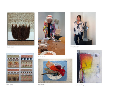 In het voorste gedeelte van het atelier van Elsa Snijder op nr. 24 Exposeert gastkunstenares Gertie Bijkerk uit Almelo haar veelzijdige werk. Zij is zelf aanwezig en kan veel vertellen over de door haar professioneel gezeefdrukte stoffen, eigenhandig verwerkt tot expressieve kledingstukken. De natuur is een van haar grote inspiratiebronnen. Lachend verklaart zij: ‘Als ik naar buiten ga, ligt het materiaal dat ik kan gebruiken, voor het oprapen, vlak voor mijn voeten! Binnen ieders bereik!’ Met grashalmen, zaden en katoenen vezels creëert ze composities en structuren op doek en ruimtelijke vormen. Door het gebruik van verschillende kleisoorten uit onder meer Portugal en Twente ontstaan warme, aquarelachtige aardetinten.